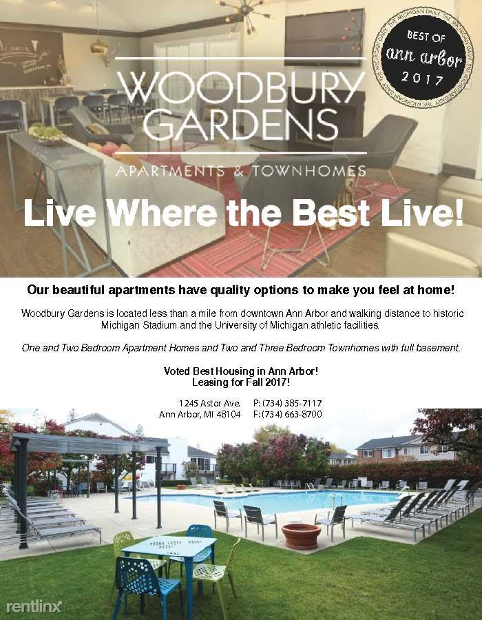 Leasing 1 and 2 bedroom Apartments & 2 and 3 bedroom Townhomes. Woodbury Gardens is Ann Arbor’s best place to call home. The apartments, townhomes and Community are designed around you, offering unmatched amenities.
